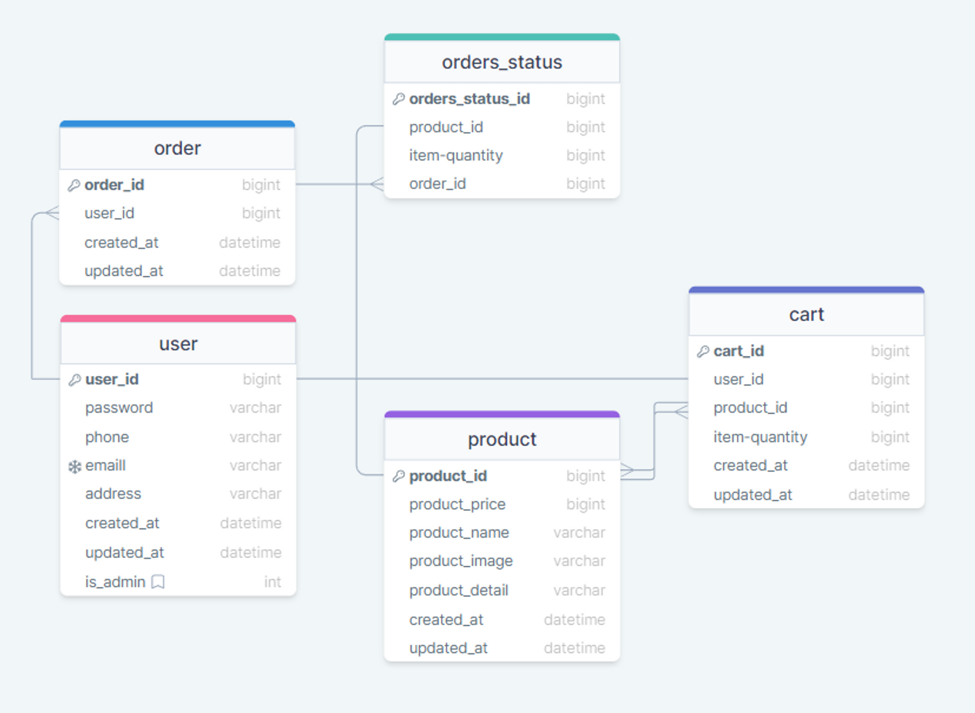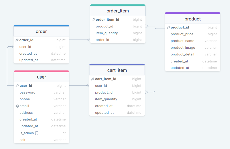 ⇒ 참고로 user와 product 테이블이 Many-to-Many인데 중간에 cart_item이 매핑 테이블 역할을 하고 있고,