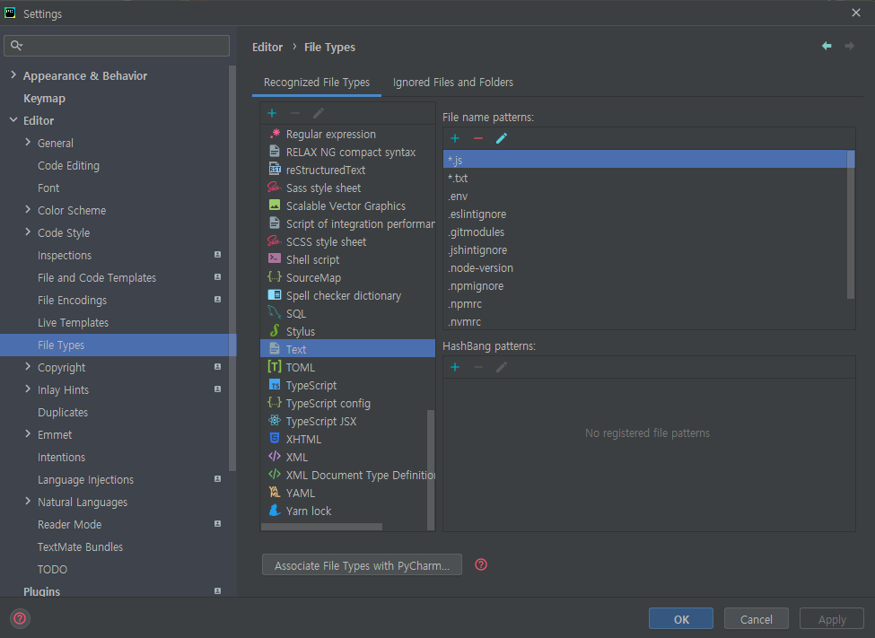 - Settings > Editor > File Types > “JavaScript”를 찾아 “*.js”패턴 추가