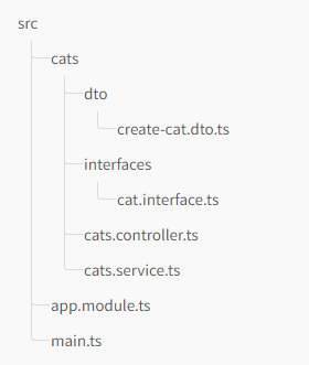 DTO와 Interface, Controller, Service가 있는 Cat 모듈의 폴더 구조는 다음과 같다: