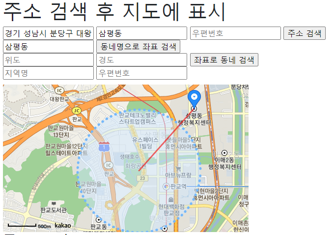 예를 들면 집 주소는 이렇게 원의 중심이었는데 동네 이름 ‘삼평동’으로 검색한 첫 주소는 반경 1km를 넘어가므로, 동네 인증 처리를 하지 않도록 한다: