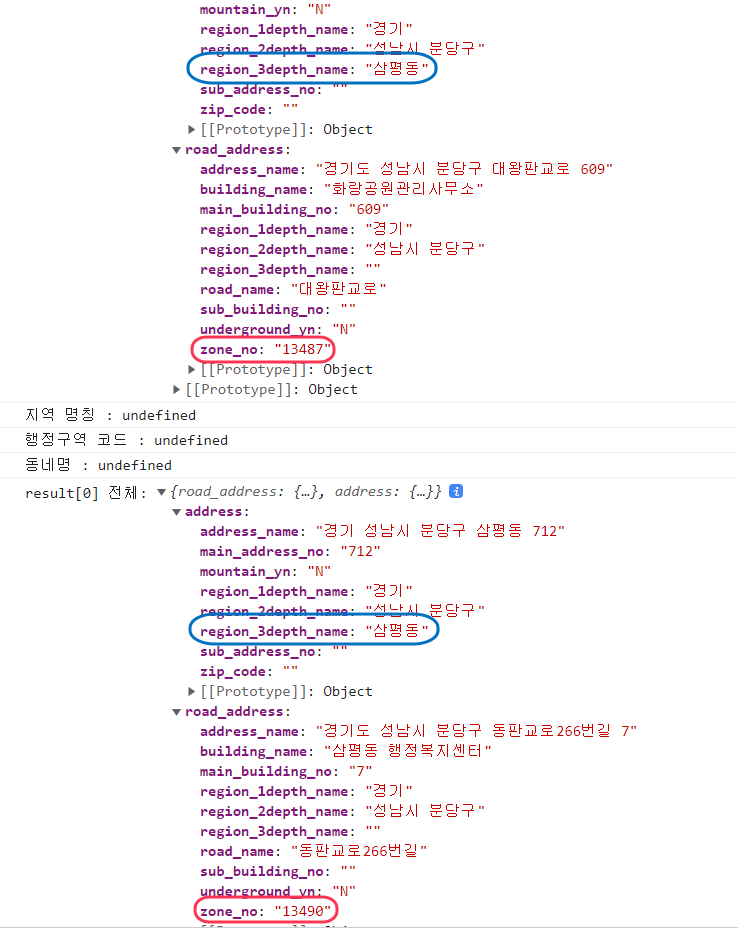 geocoder.coord2Address(경도, 위도, callback)⇒ data.address.region_3depth_name 이 바로 bname과 같은가?