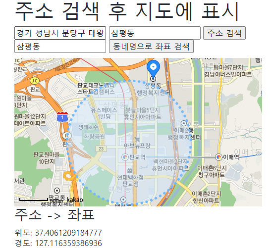 // 주소로 검색해 kakao map 좌표 객체를 얻고