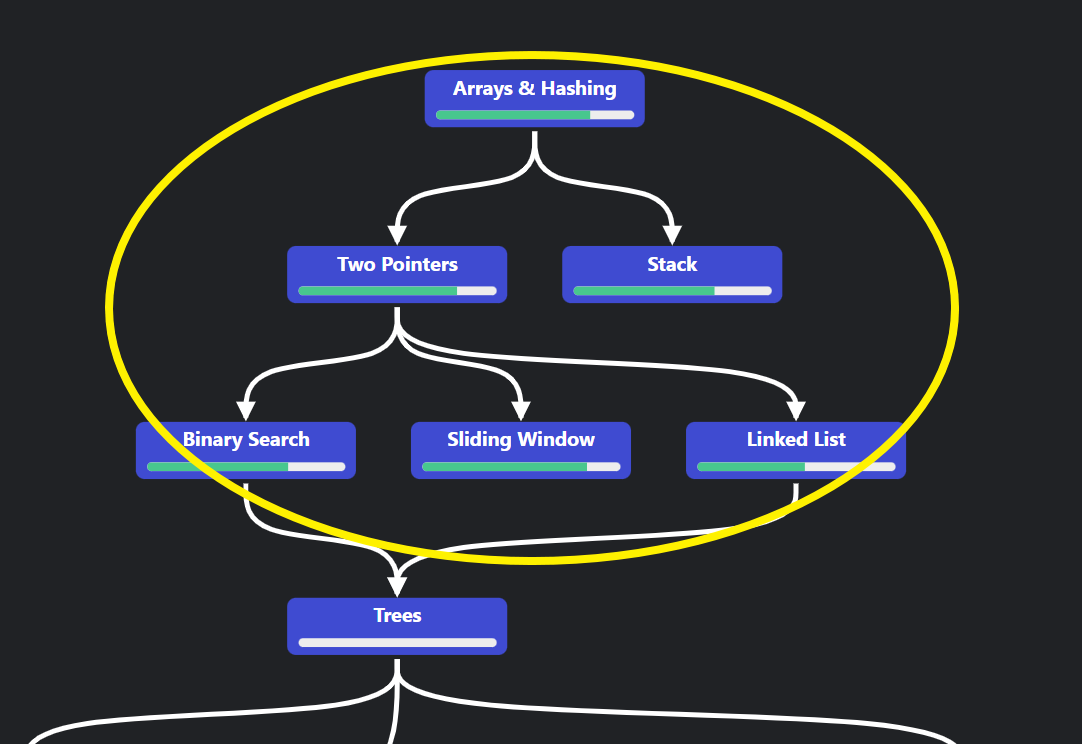 - 그동안 LeetCode에서 문제를 풀었다. 아래 로드맵에서 보는 바와 같이 Array와 Hash map, Two pointers, Stack, Binary search, Sliding window의 주제를 골라 풀었고, 지금은 Linked list 문제들을 푸는 중이다. 푼 문제는 LeetCode에 제출되어있고 테스트 코드와 세트로 로컬 js 파일로 저장되어 있으며 최근 들어서는 깃헙에도 세트로 푸시하고 있다.
