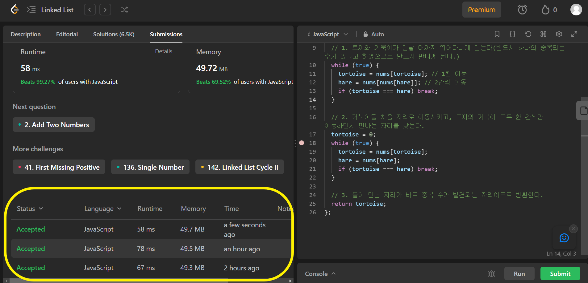 어제 배운 Floyd’s Tortoise & Hare Algorithm을 응용하는 문제를 바로 만났다. 어쩐지 문제도 키워드도 전혀 linked list에 관련되어 보이지 않는데 linked list 문제 모음에 포함되어있다 했더니, 이런 미묘한 응용문제였을 줄이야. 풀이는 Leetcode와 GitHub 레파지토리에 올렸으므로 생략한다.