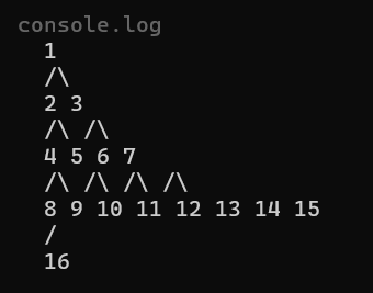 /** * Definition for a binary tree node. */ class TreeNode { val: number left: TreeNode | null right: TreeNode | null constructor(val?: number, left?: TreeNode | null, right?: TreeNode | null) { this.val = (val===undefined ? 0 : val) this.left = (left===undefined ? null : left) this.right = (right===undefined ? null : right) } printTreeLevels(node: TreeNode | null = this): string[] { const result: string[] = []; if (node === null) { return result; } // [각 노드, 노드가 위치한 레벨, 각 노드의 부모 노드] const queue: Array<[TreeNode, number, TreeNode]> = [[node, 0, null]]; let currentLevel = 0; let currentLevelString = ''; let connectorLine = ''; while (queue.length > 0) { const [currentNode, level, parentNode] = queue.shift()!; // '!': non-null assertion operator. TypeScript에게 해당 값이 항상 존재한다고 알려줌. shift()의 결과가 undefined이더라도 TypeScript의 strict 모드 경고를 발생시키지 않도록 한다. // '지금' 레벨에서 출력해야 하는(=같은 레벨의) 노드가 아니면, result 배열에 현재까지 만든 string을 넣고 string을 초기화한다. if (level !== currentLevel) { result.push(currentLevelString); result.push(connectorLine); currentLevelString = ''; connectorLine = ''; currentLevel = level; } // 현재 레벨의 자식 레벨에 이어지는 '연결 라인' 생성 // ex) connectorLine = '/\ /\ /\ /\' let connector = ''; if (currentNode.left) { connector += `/`; if (currentNode.right) { connector += '\\ '; } else connector += ' '; } else if (currentNode.right) { connector += ' \\ '; } else connector = ' '; connectorLine += connector; // 현재 레벨의 노드를 나열한 '노드 라인' 생성 // ex) currentLevelString = '8 9 10 11 12 13 14 15' if (!parentNode) currentLevelString += `${currentNode.val}`; else if (currentNode && currentNode === parentNode.left) { // 현재 노드가 '왼 자식' currentLevelString += `${currentNode.val} `; } else if (currentNode) { // 현재 노드가 '오른 자식' if (!parentNode.left) { currentLevelString += ` `; } currentLevelString += `${currentNode.val} `; } else { // 현재 노드가 null인 가상의 자식. 근데 적용이 안 되는 것 같다. currentLevelString += ' '; } // 현재 노드에 왼쪽 자식 노드가 있으면 queue(의 끝)에 추가 if (currentNode.left) { queue.push([currentNode.left, level + 1, currentNode]); } // 현재 노드에 오른쪽 자식 노드가 있으면 queue에 추가 if (currentNode.right) { queue.push([currentNode.right, level + 1, currentNode]); } } // 마지막 노드 처리: 현재까지 만들고 있는 string이 빈 문자열 ''이 아니라면 마지막으로 result 배열에 추가해줌. if (currentLevelString) { result.push(currentLevelString); result.push(connectorLine); } return result; } } // 호출: let root = new TreeNode(1); console.log(root.printTreeLevels().join('\n');결과: