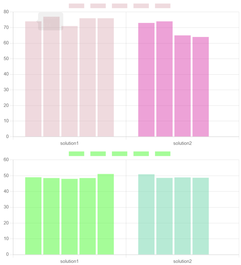 일단 한 문제에 2가지 해답을 5번 제출한다고 가정했을 때, 해답별로 그룹지어서 작성한 차트. 위가 runtime, 아래가 memory 기록이다: