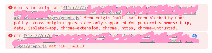 <script type=”module” src=”pages/graph.js”>태그 대신<script src=”pages/graph.js”>와 같이 사용하여 graph.js 파일을 모듈로 인식하지 않도록 하면 된다.