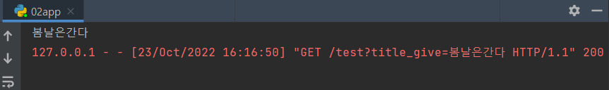 ‘/test’라는 외부 창구에, 약속된 ‘title_give’라는 항목에 대응되는 값으로 ‘봄날은간다’를 가지고 조회를 요청(GET)함.