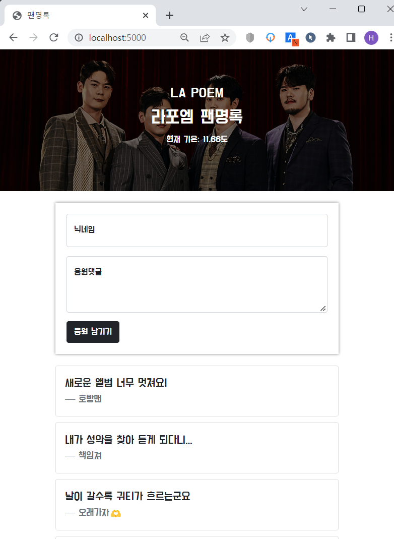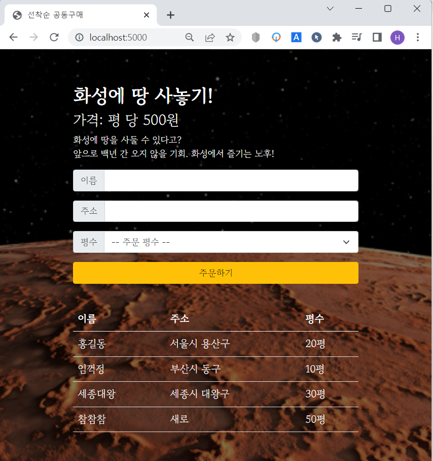 app.run('0.0.0.0', port=5000, debug=True)프론트측(index.html)