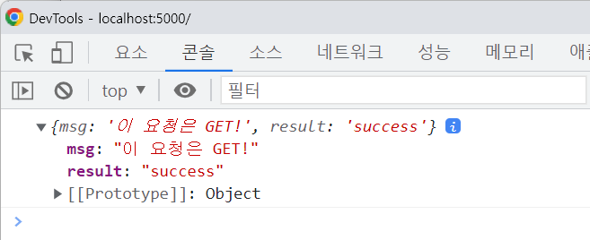 @app.route('/test', methods=['GET'])로 꾸밈받은 서버쪽 함수가 return해주는 값! 즉, 여기서response={'result':'success', 'msg': '이 요청은 GET!'}인 것이다.HTML쪽의 콘솔창이란 웹 브라우저의 개발자 도구 콘솔창을 말함.