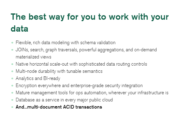 현재 NoSQL 데이터베이스 중에 이 ACID 트랜잭션을 제공하는 것들이 거의 없다는 말이 사실이라면, MongoDB가 자랑할 만 하네.