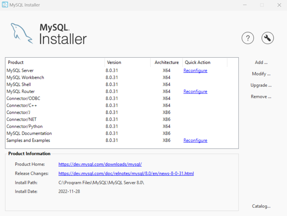 - MySQL 세트 중에서 무엇무엇이 어디에 깔려 있는지 경로를 확인하는 데 유용한 아래의 화면을 찾아가려면: 시작 > “MySQL Installer - Community” > 실행 혹은 “파일 위치 열기”.