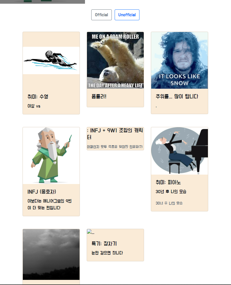 - 카드 디자인의 정석같은 (마우스오버시 박스 안에서 이미지 조금 확대, 그레이화+설명 나타남 등) (언젠가 따라해보고 싶은) : https://www.junghoe.com/