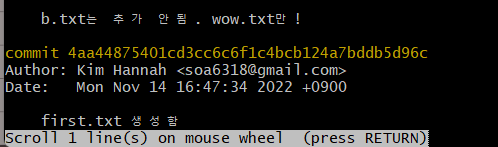 - 자세히 보니 저 “Scroll 1 line(s) on mouse wheel”이란 문구… 웃기지 않아? CUI 커맨드로 기껏 작동하고 있으면서 키보드 화살표 키도 아니고 갑자기 마우스 휠로 이동하라니! 키보드 아래 키로 끝까지 이동했을 땐 해결되지 않았고 마우스 휠로 내리는 건 시도해보지 않았는데, 의외로 q를 누르지 않고 이 방식으로 해결될지도..?