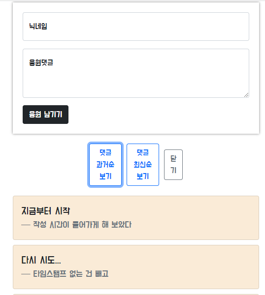 내가 한 일 : 맨 밑에 방명록(댓글)을 출력하는 기능 + 댓글 여닫기 버튼 + 최신순 과거순 정렬 기능과 버튼 추가