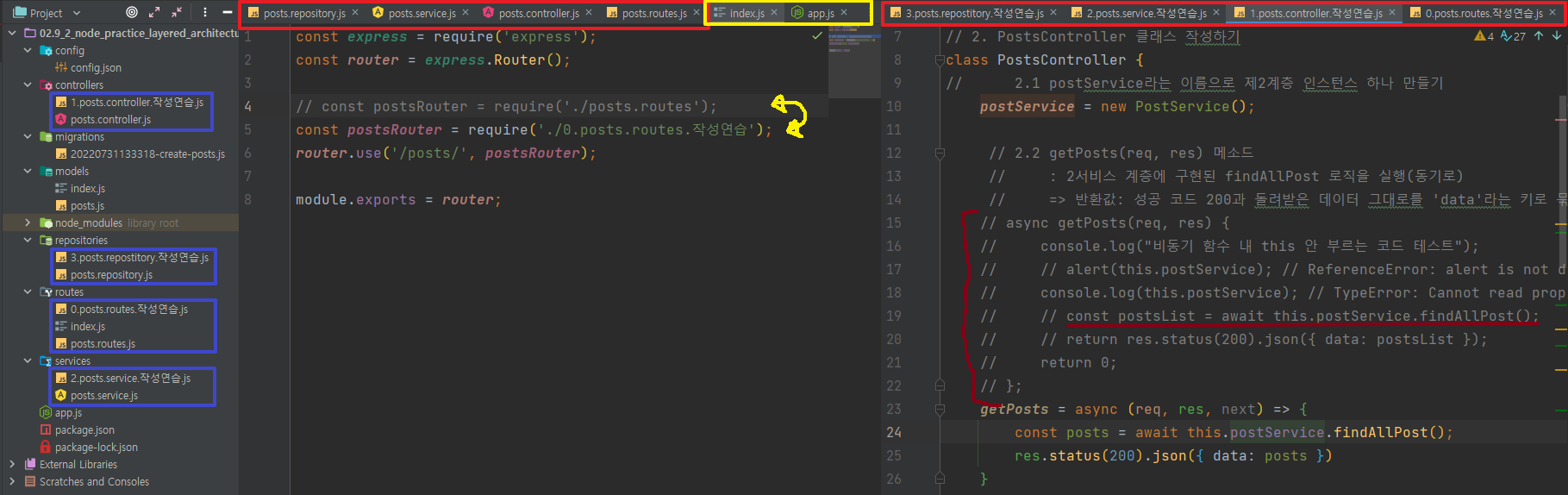 - (파란 박스) 왼쪽의 폴더 구조에서와 같이 posts.repository.js과 같은 이름의 파일들은 강의 노트에서 나온 코드 그대로이고, 3.posts.repository.작성연습.js와 같은 이름의 파일들은 내가 작성한 파일들이다.