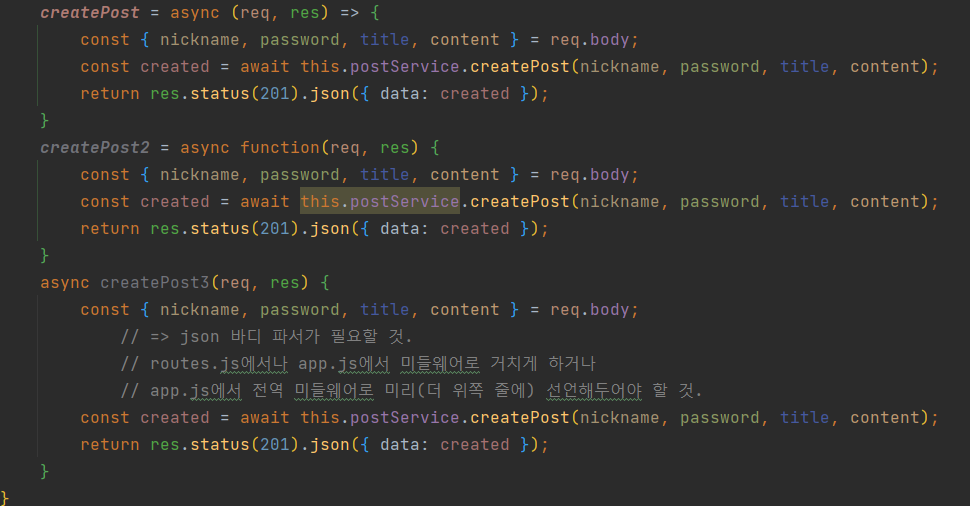 가장 미스테리는 컨트롤러→서비스 호출시 3-3 조합은 안 됐는데, 서비스→레파지토리 호출시 3-3 조합은 된다는 점이다. 이러면 단순히 “async 메소드3() { … } 방식이 안 되고 메소드1 = async () ⇒ { … } 선언 방식만 먹힌다, this의 맥락을 바인딩하기 위해서는!” 이라고 결론도 못 내린다.