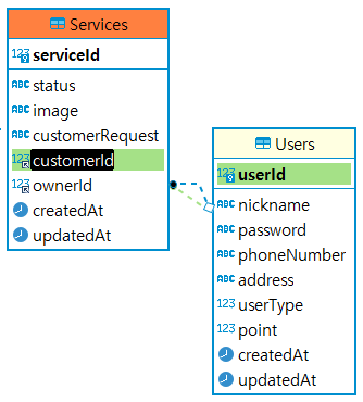 models.User.hasMany(models.Service, { foreignKey: 'customerId' }); // foreignKey: 'customer_id' 여기를 이렇게 설정하고 Service.findAll() 호출시 Unknown column 'customer_id' in 'field list' 에러가 뜨게 될 것이다.